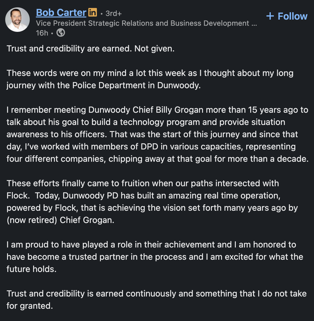 his post, has an especially close relationship with Flock. Dunwoody’s log files show Flock employees